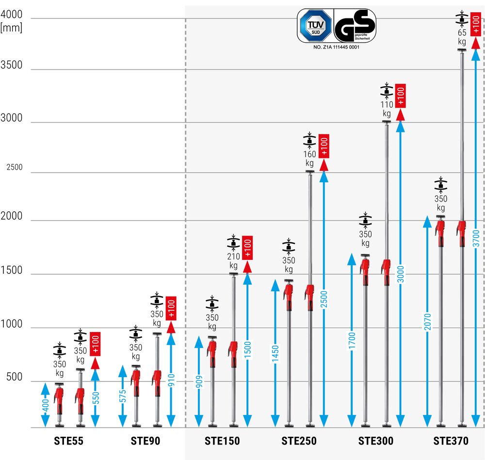Dabei stehen die Stützen für hohe Belastbarkeit und komfortable Einhandbedienung. Mit einer maximalen Tragkraft von 350 kg bei eingefahrener Teleskopstange – bei den zwei kürzesten Varianten sogar im komplett ausgezogenen Zustand – sind sie die leistungsstärksten am Markt. Zusätzlich sind die vier längsten Modelle GS-zertifiziert und bieten damit geprüfte Sicherheit.