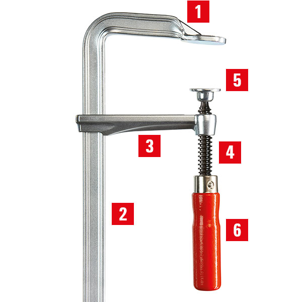The function of a screw clamp is based on the friction and tilting between rail and sliding arm. It is important, therefore, that the rail is always kept free of grease, oil or dried glue. Particularly critical on the rail are waxes and release agents containing silicone. Such residues must be removed as quickly as possible using solvents, wire brushes or sandpaper. Both the spindle and the pressure plate joint should be lubricated regularly with a little oil. Spray oil is especially suitable for this purpose. In this way, the smooth running of the screw clamp is maintained for a long time with optimum clamping force.
